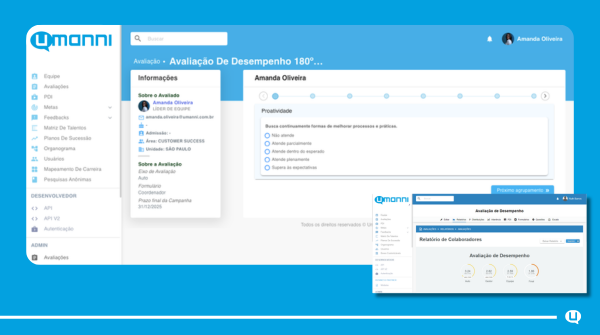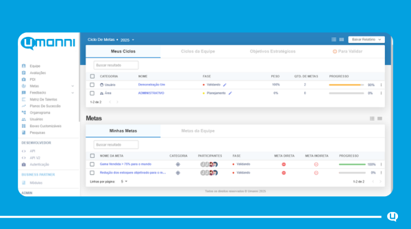 O Umanni RH oferece diversos módulos para gerenciar competências e performance da sua equipe. Com uma experiência personalizada, que vai desde a aparência até a metodologia aplicada, esta ferramenta é a indicada quando a gestão de performance da sua empresa precisa de flexibilidade.